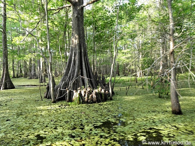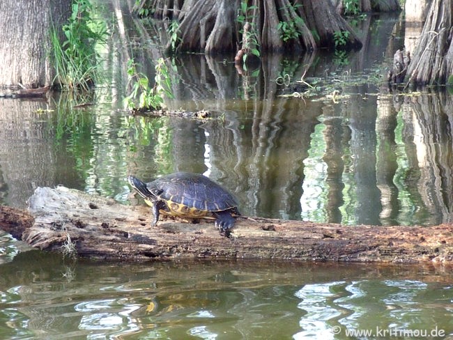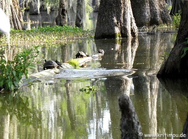 ![]() Immer wieder ändert sich, je nach Sonnenlichteinfall, die Farbgebung: einmal wirkt die Baumlandschaft grau, dann wieder ganz hell und gelblich-grün, in allen dazwischenliegenden Farbnuancen, die sich im klaren Wasser widerspiegeln. Manchmal verschwimmt im Gegenlicht sogar die Grenze zwischen dem, was über der Wasseroberfläche sichtbar ist und dessen Spiegelung. Dadurch wirkt diese Baumlandschaft verwunschen und märchenhaft, oder besser: archaisch. Schöner und eindrucksvoller könnte ich mir diese Tour nicht vorstellen. Ich glaube, wir alle im Boot sind ein bisschen verzaubert, wie ich den bewundernden Lauten der Mitreisenden entnehme. ![]() Immer wieder begegnen wir Alligatoren, diesen urzeitlichen Wesen, die mal schnell, mal langsam abtauchen, wenn wir ihnen doch zu nahe kommen. Mal erkennen wir nur den Kopf, manchmal die gesamte Silhouette, wunderschöne Tiere in verschiedenen Größen, die irgendwie zahm wirken, aber dennoch Wildtiere sind. Dadurch, dass sie hier nicht gefüttert werden, behalten sie ihre natürliche Scheu, sodass man sich um Gefahren in dem schmalen Boot, so nahe an der Wasseroberfläche, tatsächlich keine Gedanken machen muss. Die Hände würde ich während der Bootsfahrt dennoch nicht im Wasser baumeln lassen. ![]() Im letzten Teil unseres Ausflugs steuert uns Shawn in ein besonderes Areal des Sees, in dem die Wasseroberfläche über und über mit Wasserpflanzen bedeckt ist, ein grüner Teppich, aus dem die knorrigen Stämme der Wasserbäume in die Höhe ragen. Immer wieder stößt das Boot an Hindernisse, die unter der Wasseroberfläche liegen, doch geschickt wird es wieder weggesteuert.