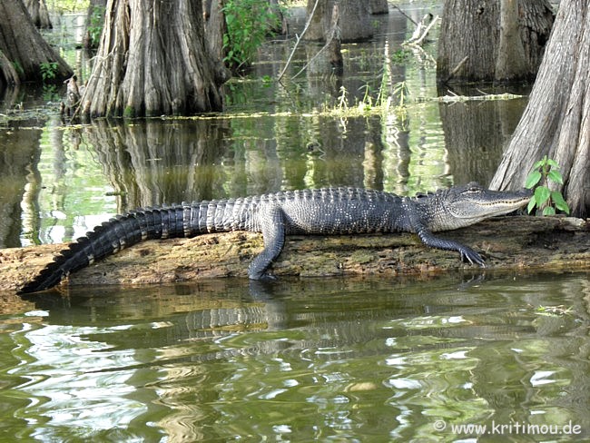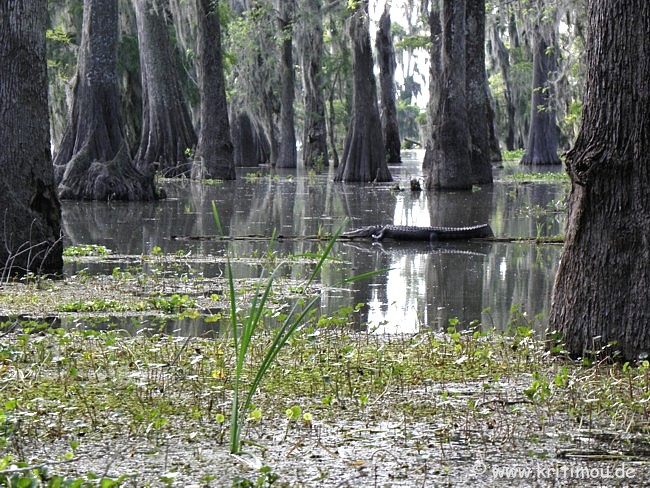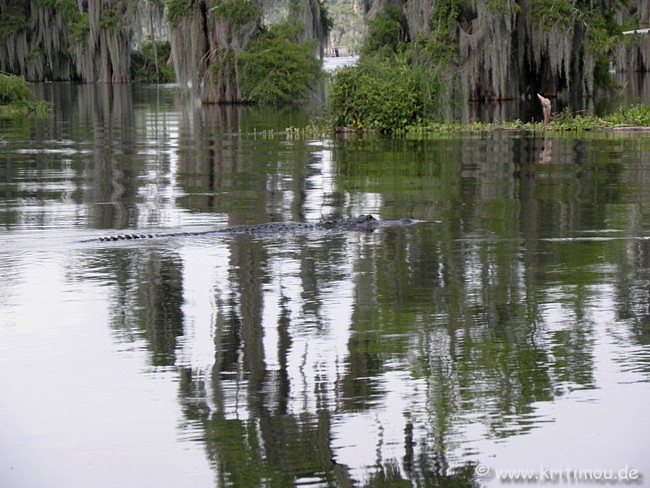 ![]() Große Wasservögel stehen auf Inselchen im See oder sitzen auf Bäumen und Baumstümpfen, fliegen aber jedes Mal weg, sobald wir bei unserer langsamen Annäherung eine unsichtbare Grenze überschritten haben. Sie mit meiner schwerfälligen Kamera zu fotografieren, ist fast nicht möglich, zu ähnlich sehen sich die Sumpflandschaft und ihr verschwommener Spiegel im Wasser. ![]() Während ich mich noch mit der Technik meiner Kamera herumplage, haben wir gewendet und fahren wieder zurück zur Anlegestelle, da die beiden Nachzügler nun doch angekommen sind und schnell aufgelesen werden. Natürlich sind wir alle auf die erste Sichtung eines Alligators oder kurz Gators (so heißen sie hier) gespannt, denn der See ist voll von ihnen. Doch eine Weile soll es noch dauern. Sobald sie das Boot hören, machen sie sich aus dem Staub, oder besser: sie tauchen ab. Doch irgendwann ist es dann soweit: Der größte Gator im Lake Martin, so erfahren wir, gibt sich die Ehre.